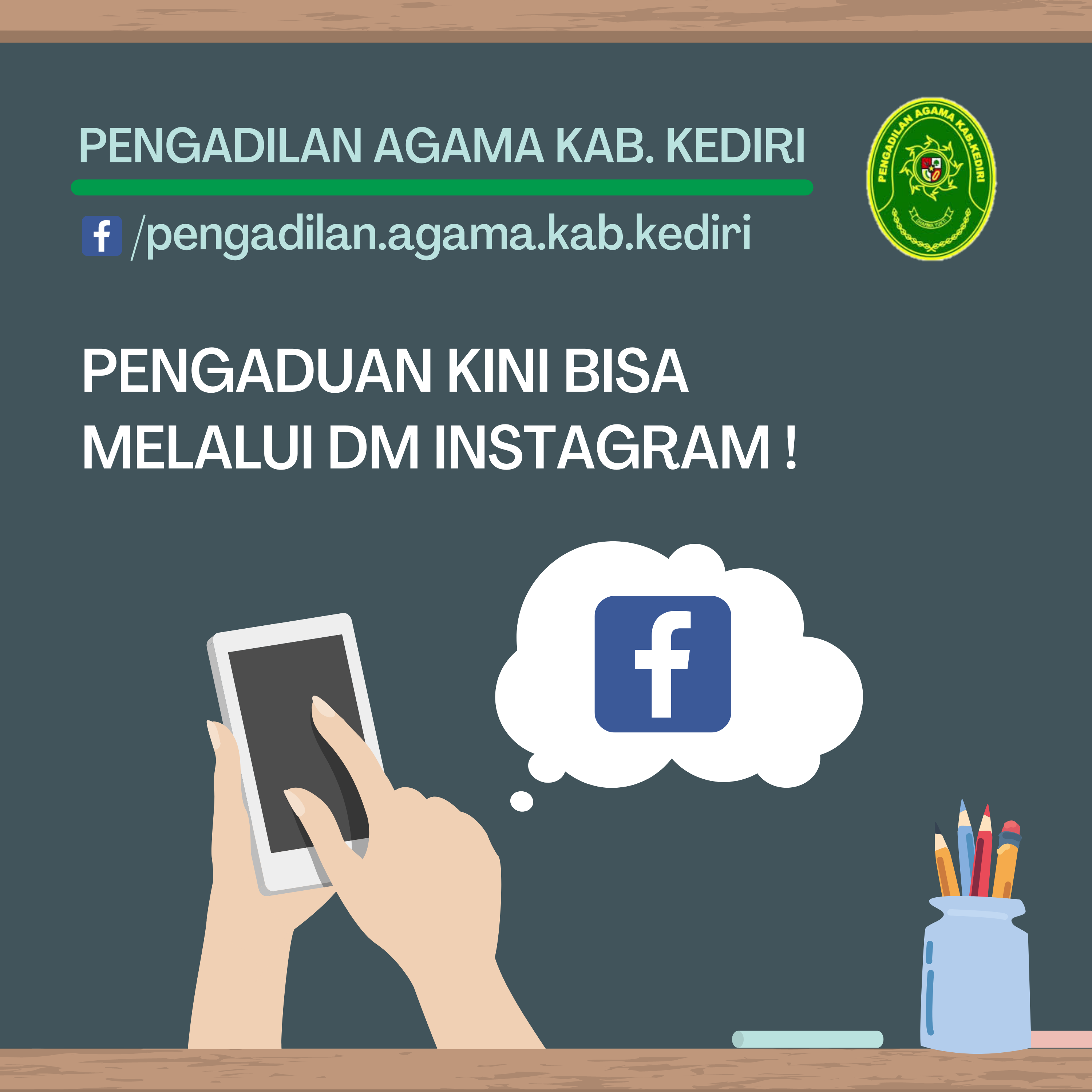 Masyarakat bisa melakukan pengaduan melalui DM Facebook resmi Pengadilan Agama Kabupaten Kediri, yaitu /pengadilan.agama.kab.kediri