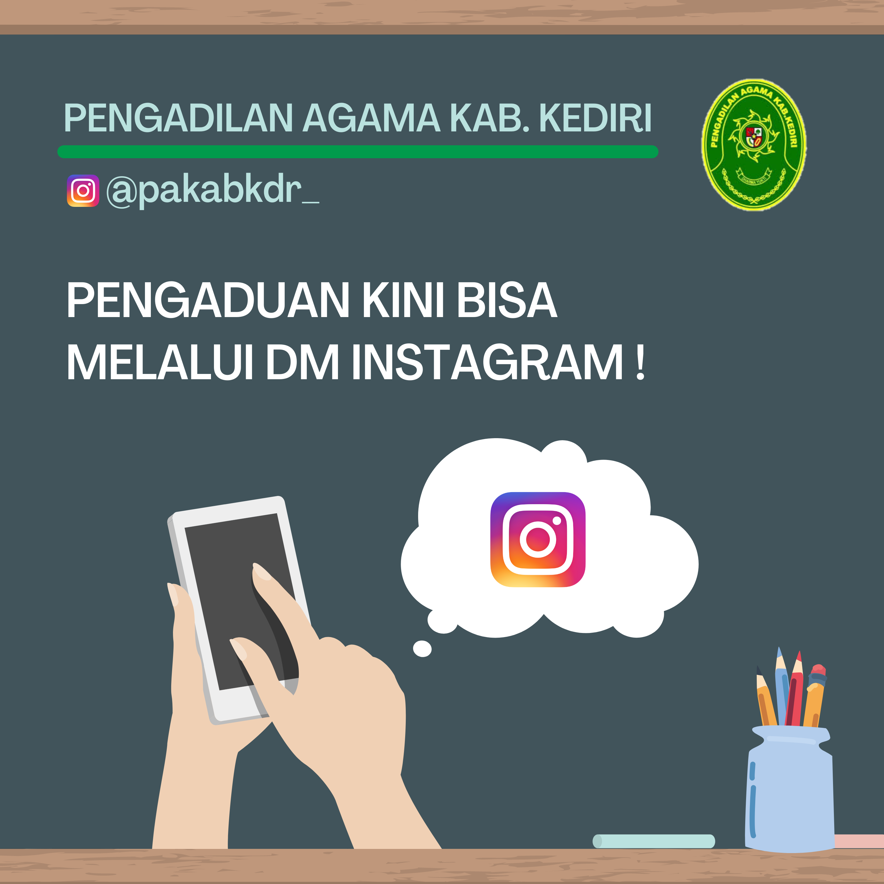 Masyarakat bisa melakukan pengaduan melalui DM Instagram resmi Pengadilan Agama Kabupaten Kediri, yaitu @pakabkdr_