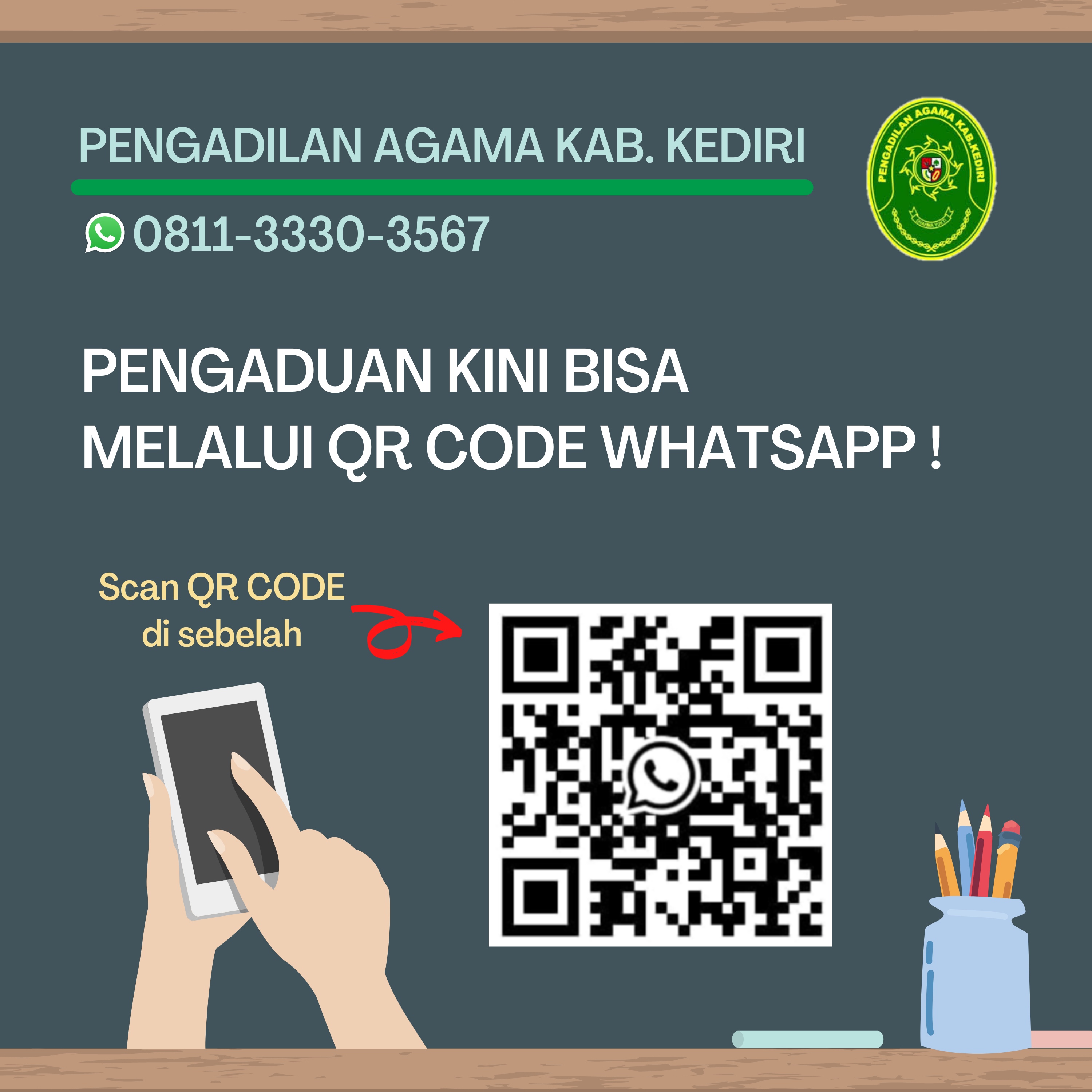 Masyarakat bisa melakukan pengaduan melalui Whatsapp resmi Pengadilan Agama Kabupaten Kediri, yaitu di nomor 0811-3330-3567, dan nomor tersebut dapat langsung diakses cukup dengan melakukan scan barcode yang kami publikasikan di media sosial kami.